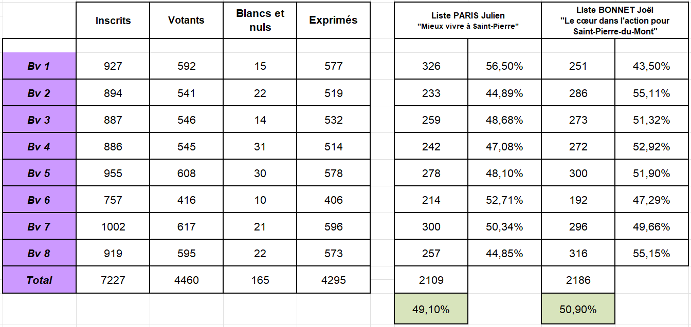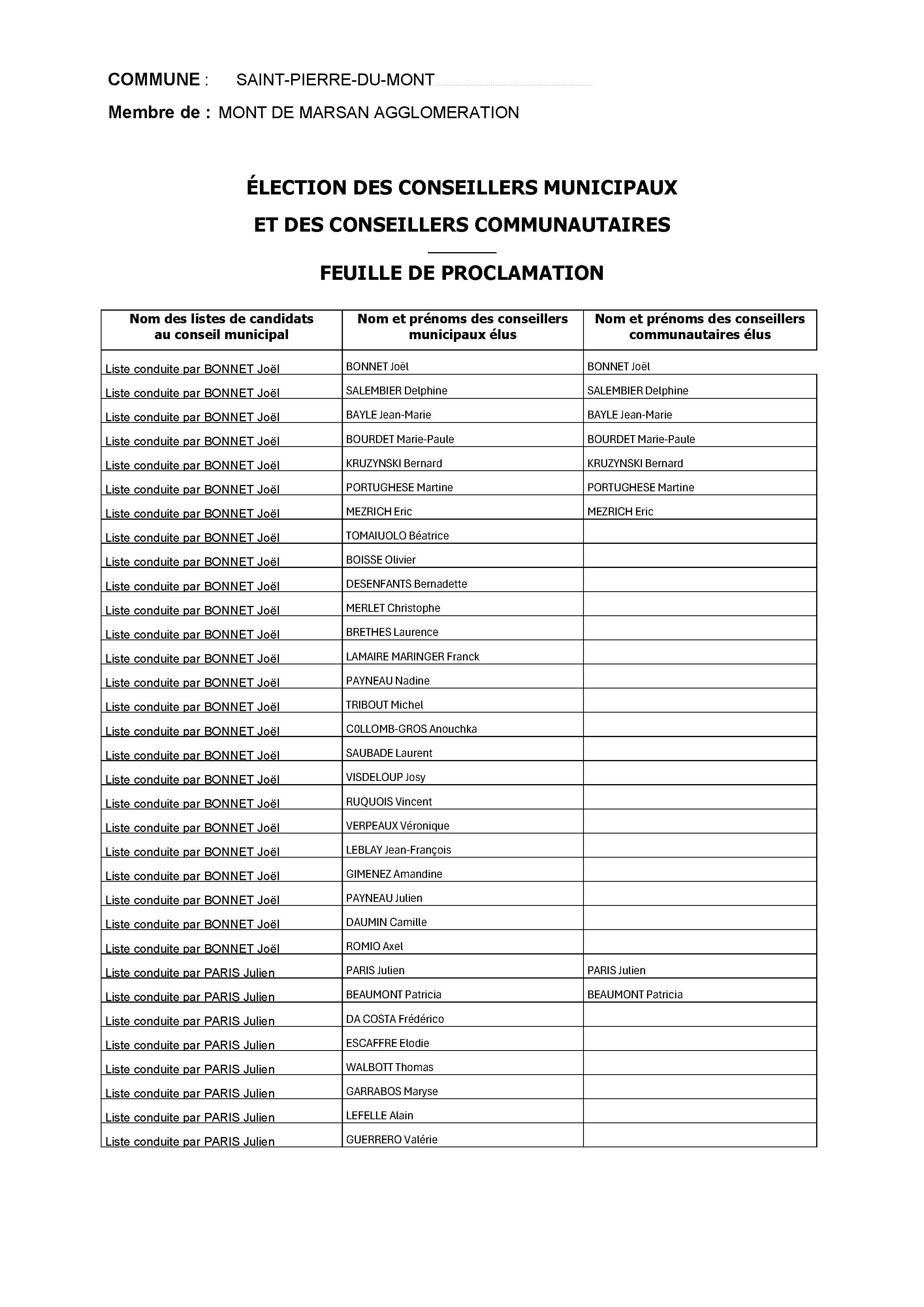 - "Le cœur dans l'action pour Saint-Pierre-du-Mont" - suffrages : 2186 voix soit 50,90 %