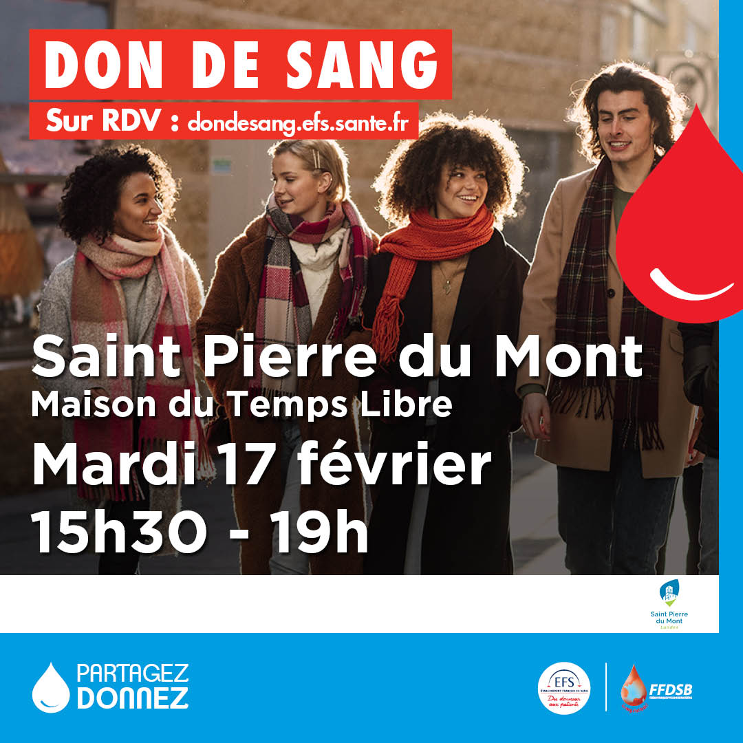 L'Établissement Français du Sang organise une collecte de sang le mardi 17 février 2026 de 15h30 à 19h00 à la Maison du Temps Libre.