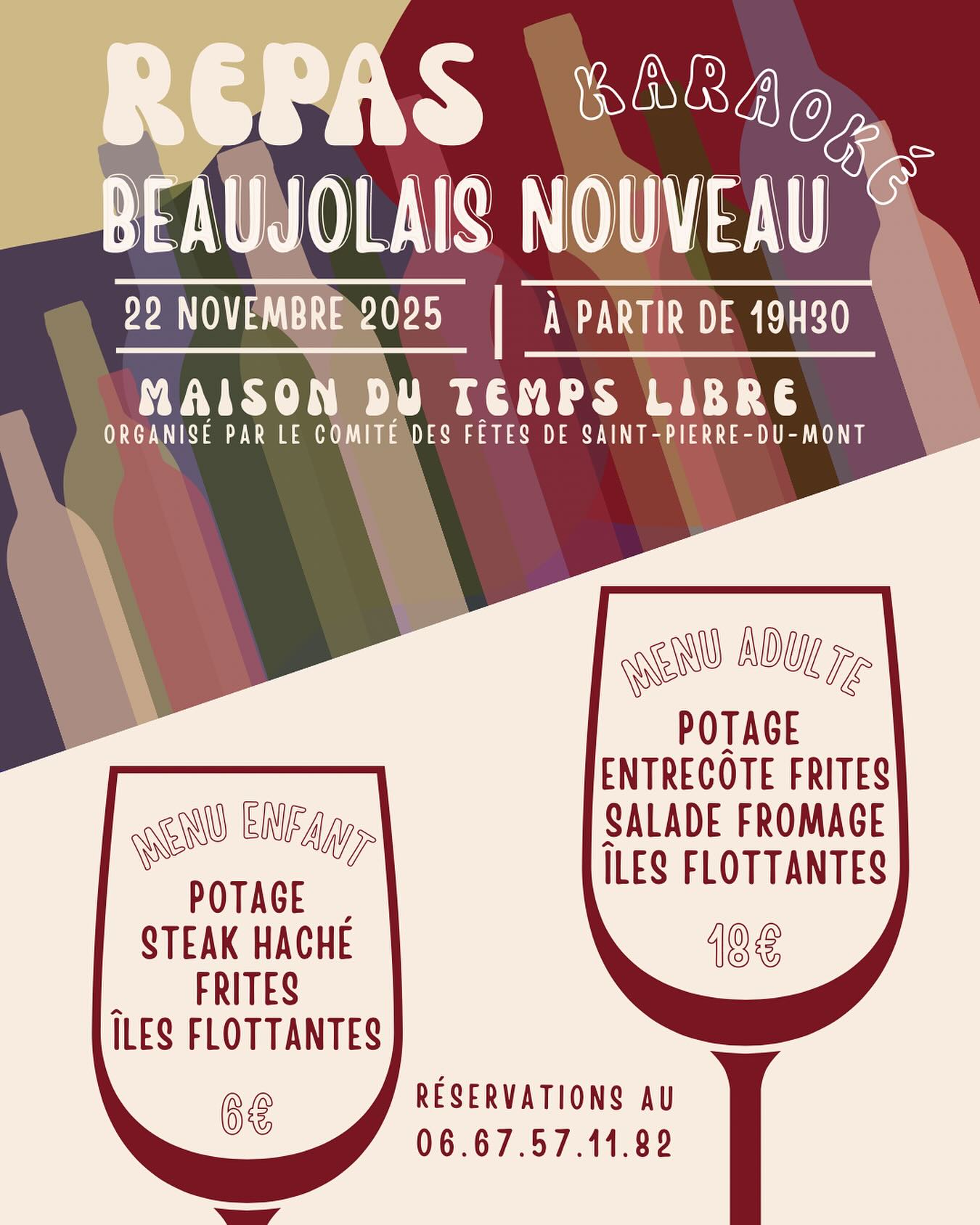 Le Comité des Fêtes de Saint-Pierre-du-Mont vous donne rendez-vous pour son repas Beaujolais le samedi 22 novembre 2025 à partir de 19h30 à la Maison du Temps Libre.