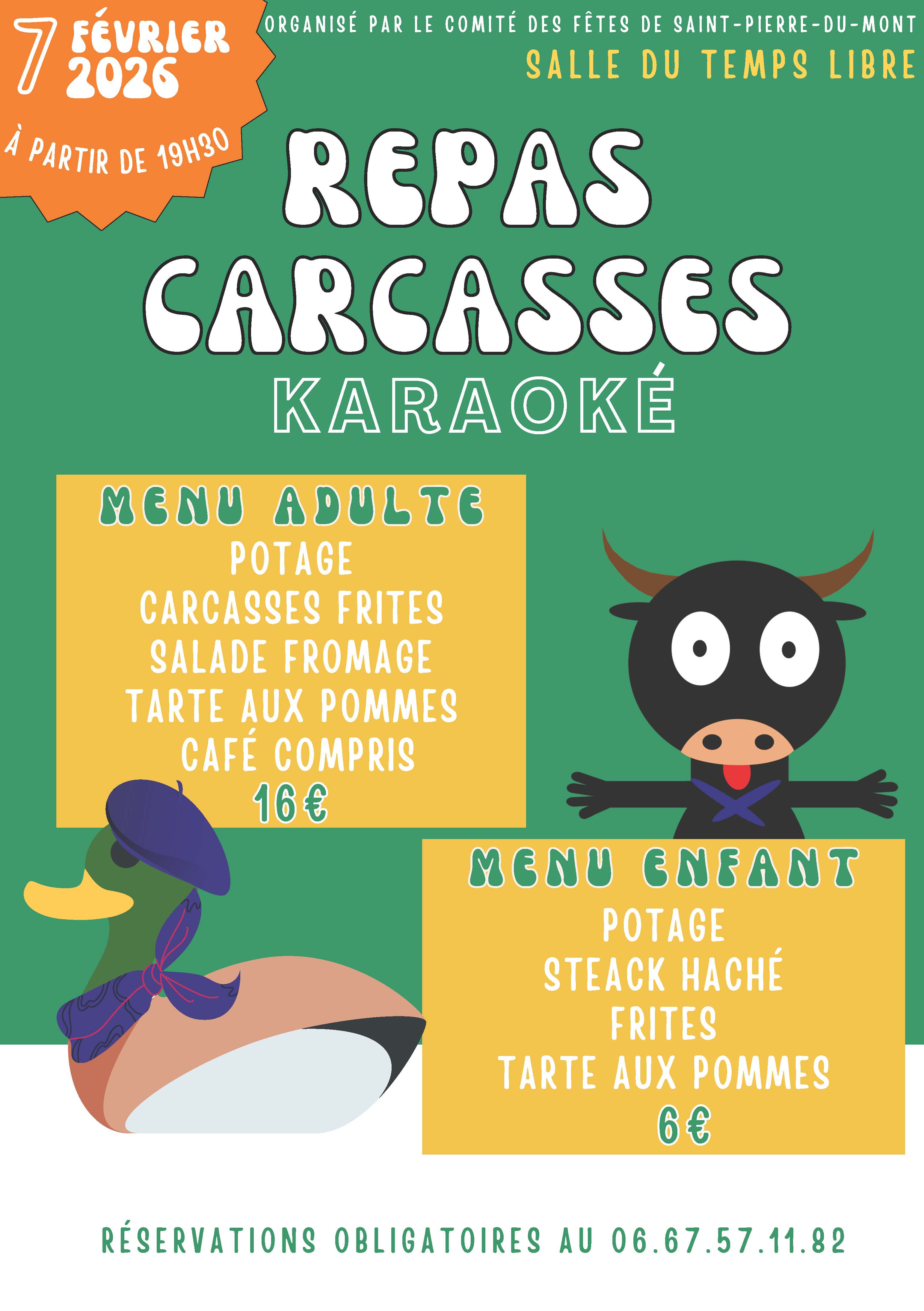 Le Comité des fêtes de Saint-Pierre-du-Mont vous convie à son traditionnel repas carcasses - karaoké le samedi 7 février 2026 dès 19h30 à la Maison du Temps Libre.